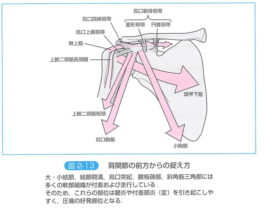 肩関節の伸展、内転、外旋方向に誘導すると、前部繊維が緊張するため圧痛部位を確認しやすい。